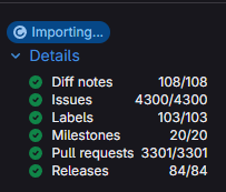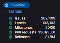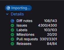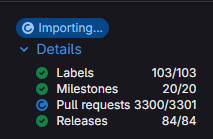 - Confirm issues, PRs, commits, imported [IN PROGRESS] The importing went smoothly for the first few minutes, however it seemed to be stuck after a while and needed a page refresh.